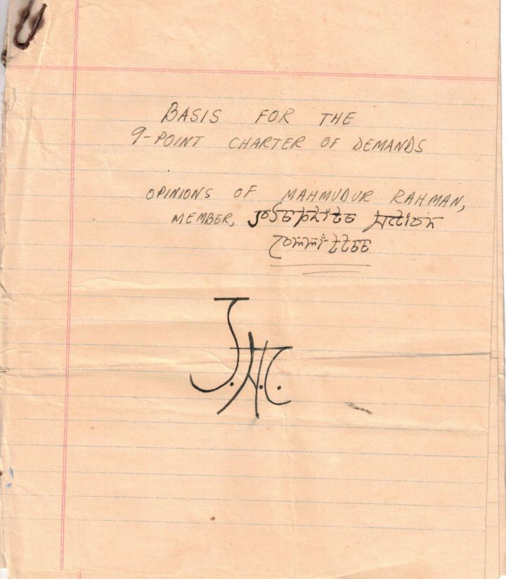 Some years ago, my brother Sani in Dhaka told me he found the speech. But he died before he could give it to me. When I was visiting in August, I couldn’t find it when I rummaged through his papers. I did find a small sheaf of notebook pages with a rusted paperclip holding them together. The cover page read, “Basis for the 9-point charter of demands: Opinions of Mahmudur Rahman, Member, Josephite Action Committee, JAC.” I have no memory of this document, but I must have written this up as talking points before our group met with the Brothers.