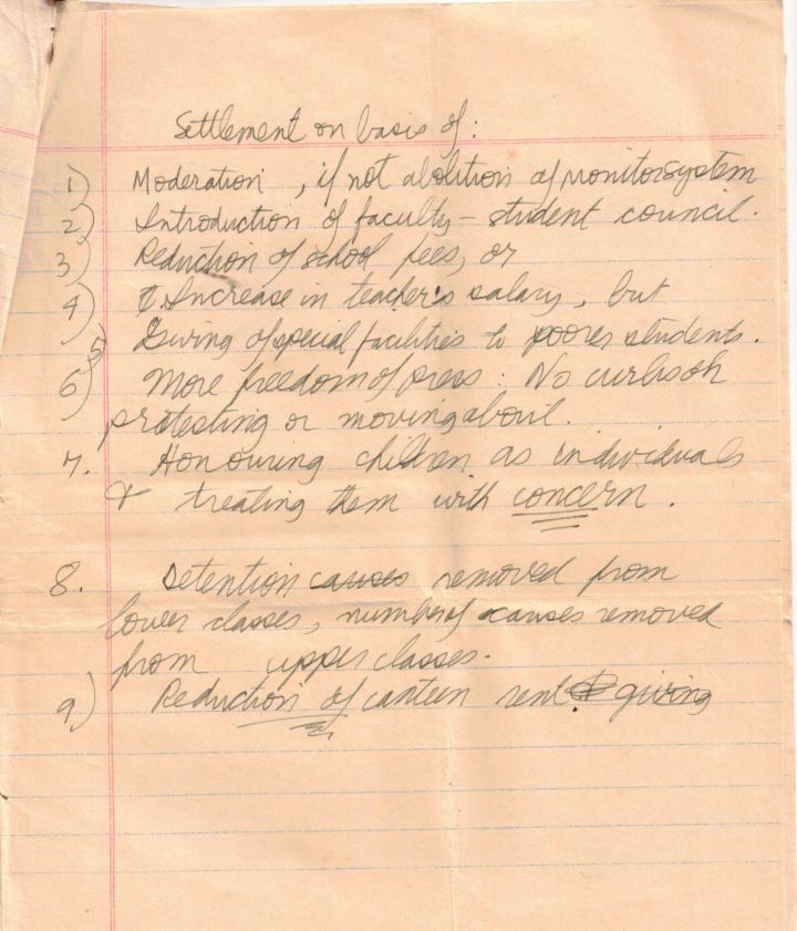 Our demands included: 1) A student union; 2) Abolition of the hall monitor system; 3) Reduction of tuition fees; 4) Scholarships for poor students; 5) Increasing teacher salaries; 6) Freedom of press for the student newspaper; 7) Reduction in the rent of the canteen. Kumar and I had put together the list after talking to fellow students, a few of the lay teachers told us how poorly they were paid, and the man who ran the canteen had complained his rent had been raised. The hall monitor system was widely hated; Class Ten boys were chosen as prefects and lorded it over other students with power to give out detentions.