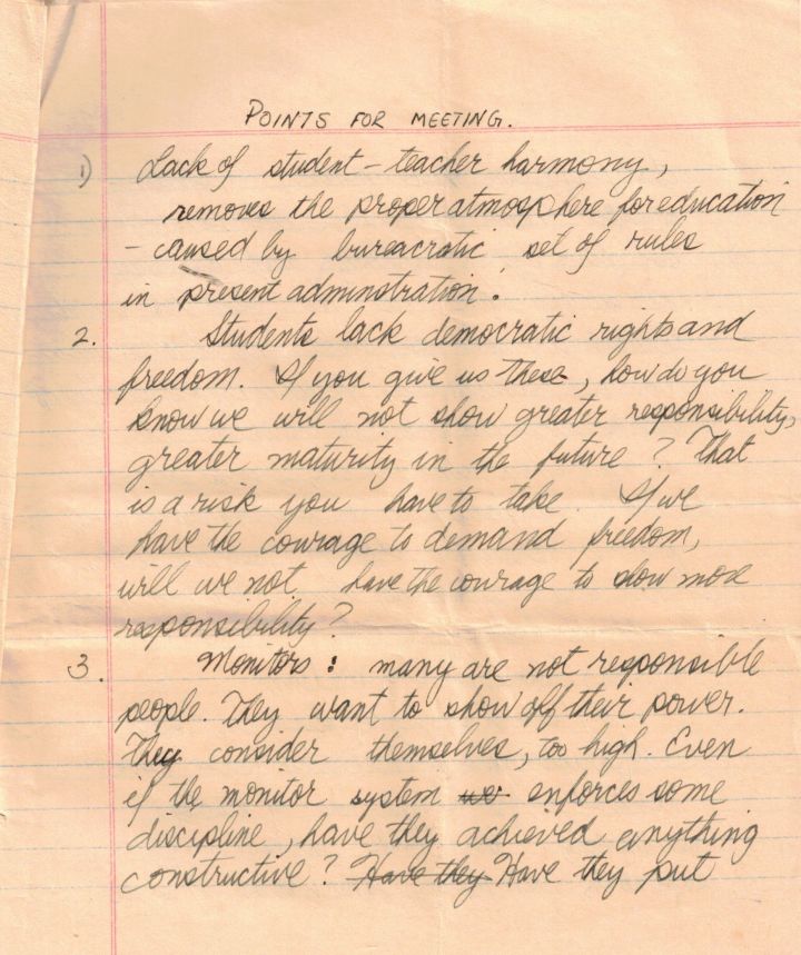And though things were put in terms of demands and rights, the tone was not adversarial. The goal was to have better relations among students, with teachers, with the school. It seems that though the demand was for a student council to voice our concerns, I was open to the idea of a faculty-student council. I noted, “Lack of student-teacher harmony, removes the proper atmosphere for education—caused by bureaucratic set of rules in present administration.”