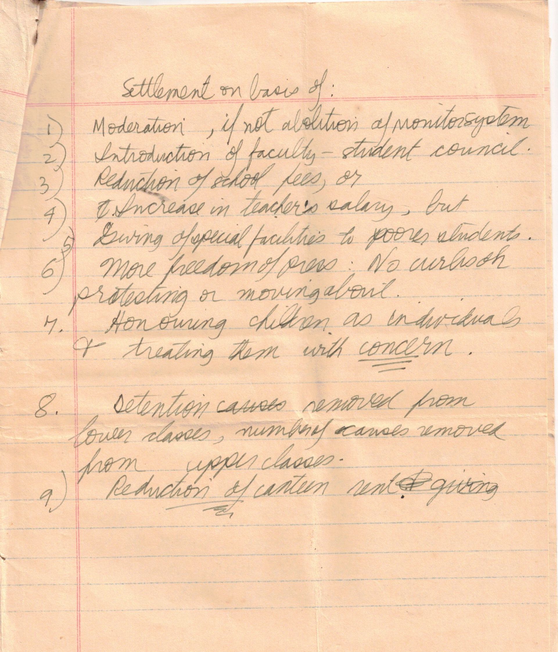 Our demands included: 1) A student union; 2) Abolition of the hall monitor system; 3) Reduction of tuition fees; 4) Scholarships for poor students; 5) Increasing teacher salaries; 6) Freedom of press for the student newspaper; 7) Reduction in the rent of the canteen. Kumar and I had put together the list after talking to fellow students, a few of the lay teachers told us how poorly they were paid, and the man who ran the canteen had complained his rent had been raised. The hall monitor system was widely hated; Class Ten boys were chosen as prefects and lorded it over other students with power to give out detentions.