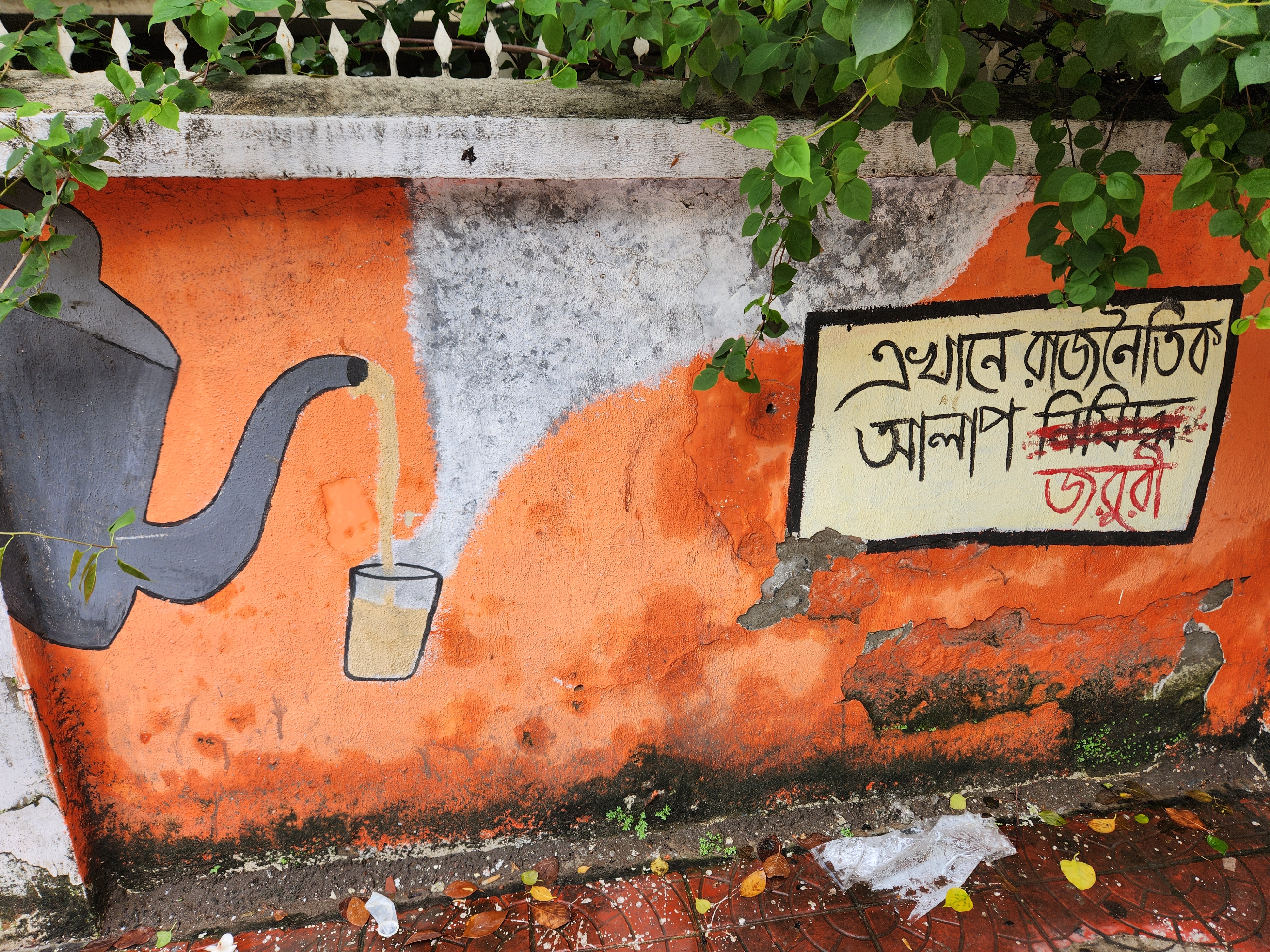 When I visited Dhaka last August, a street art panel on Road 16 in Dhanmondi caught my eye. Right next to the entrance to Sunbeam’s School, it had an image of tea being poured from a kettle and the words, Eikhane Rajnitir Alap Nishiddhyo, with Nishiddhyo crossed out and replaced with Joruri. Translation: Political Discussions Here Are Prohibited, with Prohibited crossed out and replaced with Urgent.